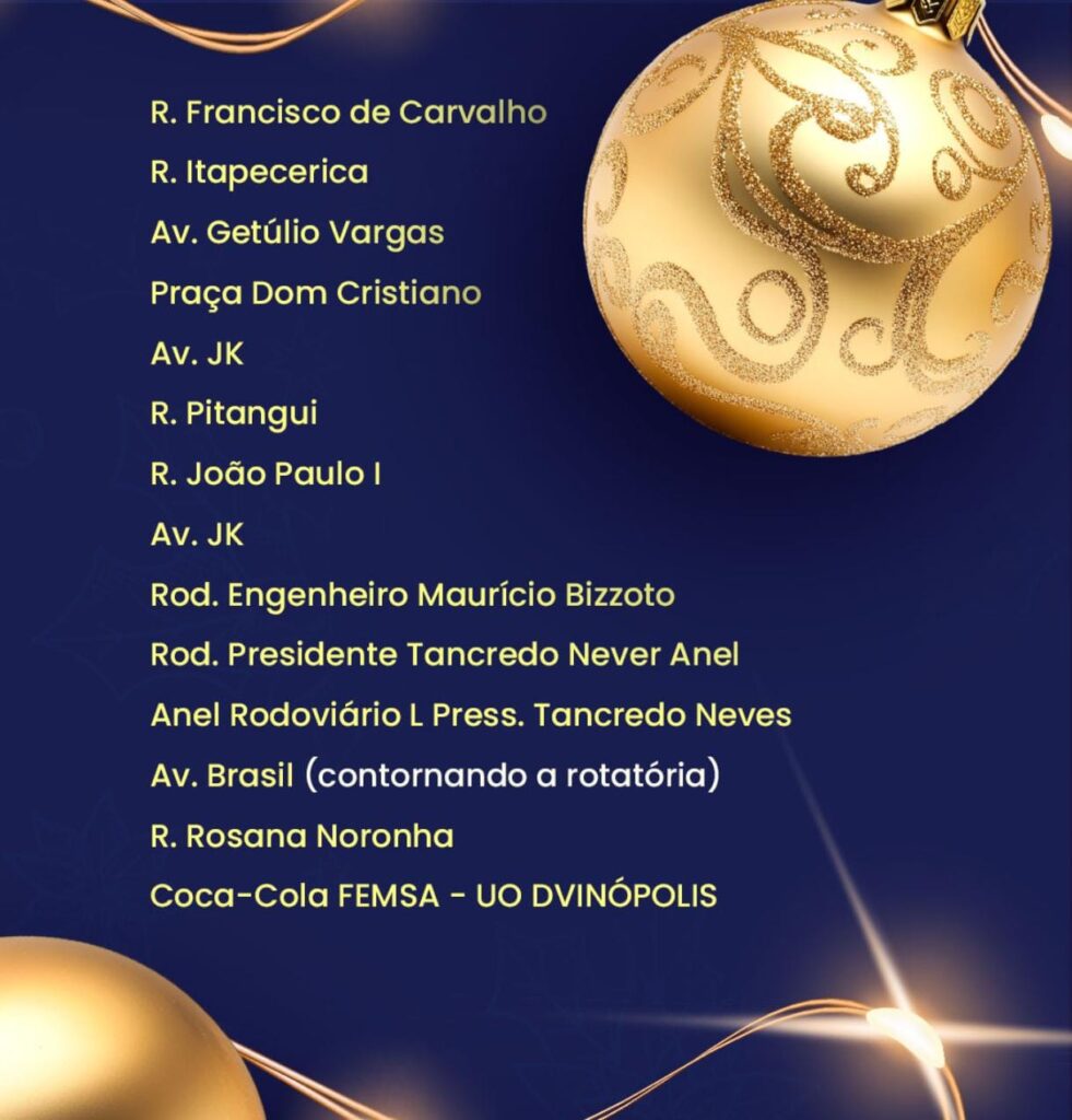 Portanto, o desfile chegará com caminhões iluminados, trilha sonora natalina e personagens temáticos que reforçam o clima de celebração. Portanto, o objetivo consiste em levar encanto para ruas e avenidas da cidade, criar memórias afetivas para as famílias e marcar a abertura das festividades de fim de ano em Divinópolis.